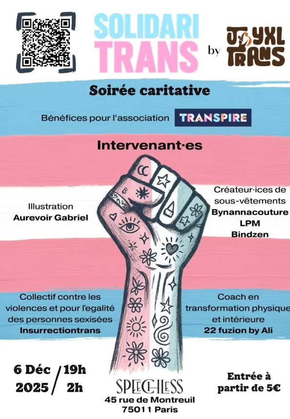 La soirée est organisée par JoyXL Trans et l’ensemble des bénéfices seront reversés à l’association Transpire, engagée dans l’accompagnement des personnes trans et non-binaires.